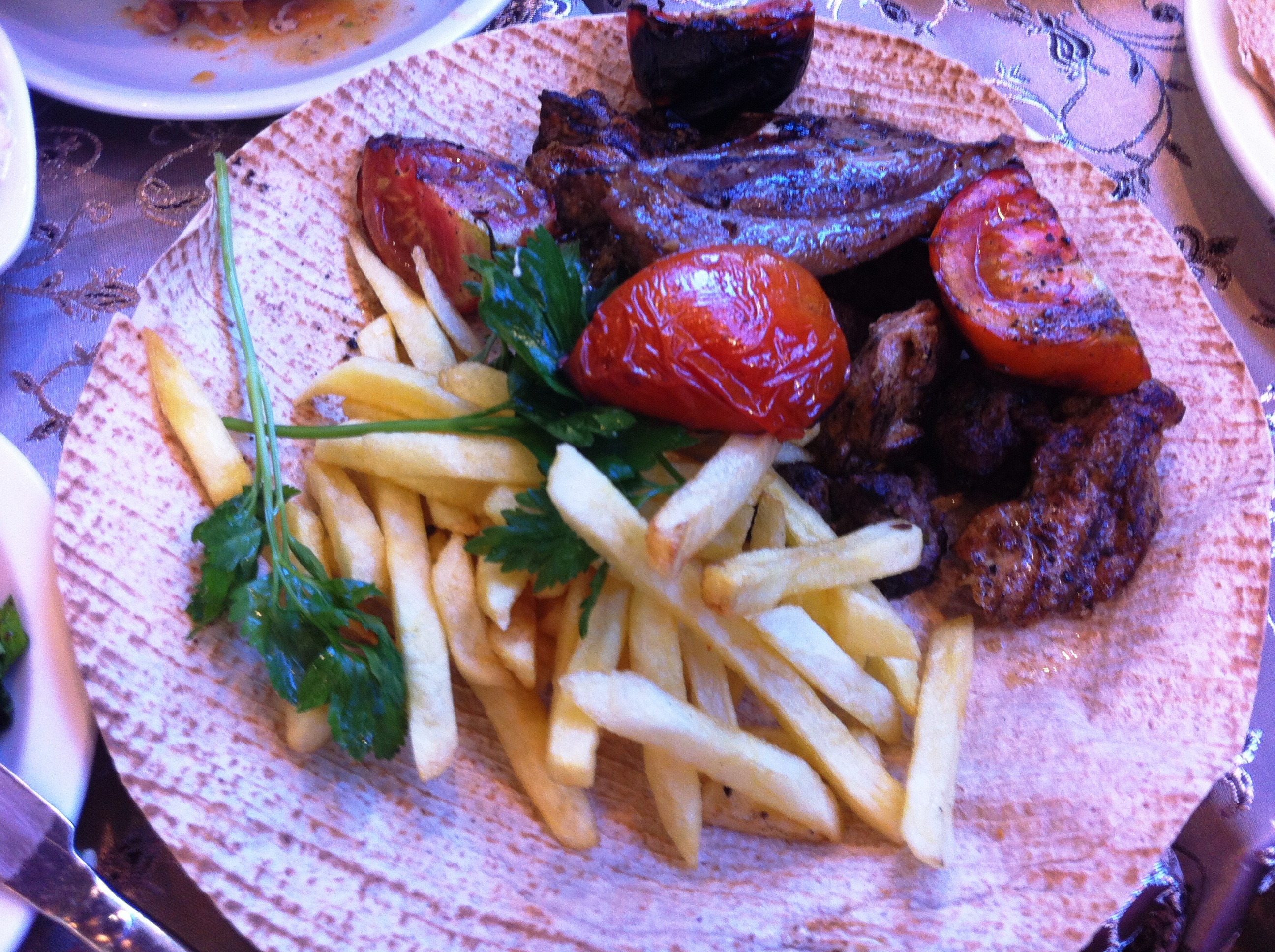 ראשונים מגיעים הסלטים. עוד ועוד צלוחיות שברובן מסתתרים סלטים די מוכרים, טעימים וטריים למגע, כמו טבולה, טחינה עם חציל, חציל קלוי, סלט ירקות ועגבניות חתוכות… אופס! העגבניות החתוכות? המנה נהדרת, אך יש שם גם חתיכות קטנות של פלפל, שתפס אותנו חזק וגרם לנו לכוויה של ממש בפה. זהירות, מומלץ רק למי שיש לו קילומטראז’ ארוך ב”חריפים”.